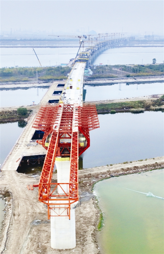 昨日,中铁建大桥局完成津潍高铁全线唯一采用移动模架工艺施工的现浇梁浇筑,实现了“空中造桥”。此次完工的桥梁位于滨海新区,上跨荒地排河和热水河,梁体总重超6000吨,相当于约2000辆家用轿车总重量。
