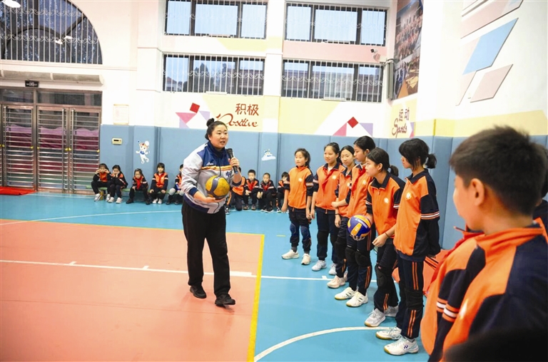 一传到位,二传精准,大力扣杀……排球场上一群稚气未脱的女孩儿奋力拼搏。今天,她们特别兴奋,因为奥运冠军来给她们当指导了。
