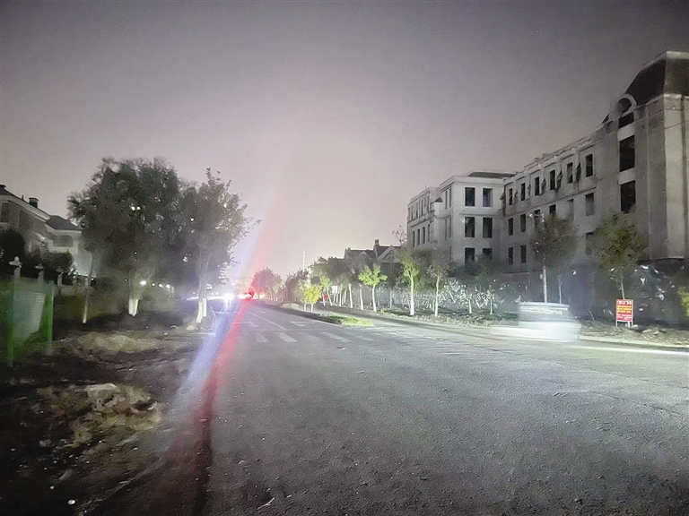 10月30日晚,记者针对市民集中反映的静海区团泊镇部分道路路灯不亮问题,进行了夜间实地走访。19时30分,记者首先到达汇水路。该道路一侧为天津仁爱学院,另一侧毗邻绿地海域香颂小区和天津湖语公园小区。现场可见,整条汇水路只有部分路灯发光,路面照明主要依赖过往车辆的灯光。