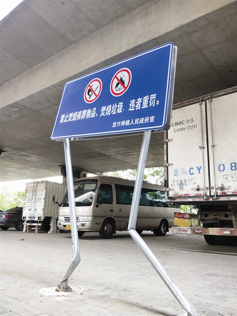 | 警示牌被撞变形 市民宋先生反映,北辰区志成路与外环东路交叉口桥下空地上,一个警示牌被车辆撞击出现损坏弯曲,有碍环境观瞻。 文/摄 记者 刘波 |