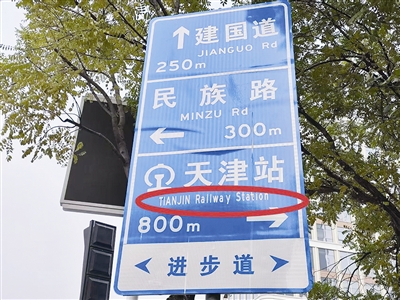 | 指路牌拼写有误 市民刘先生反映,河北区五经路与进步道交口,一面交通指路牌“天津站”下面的英文拼写有误,望及时改正。 文/摄 记者 狄慧 |