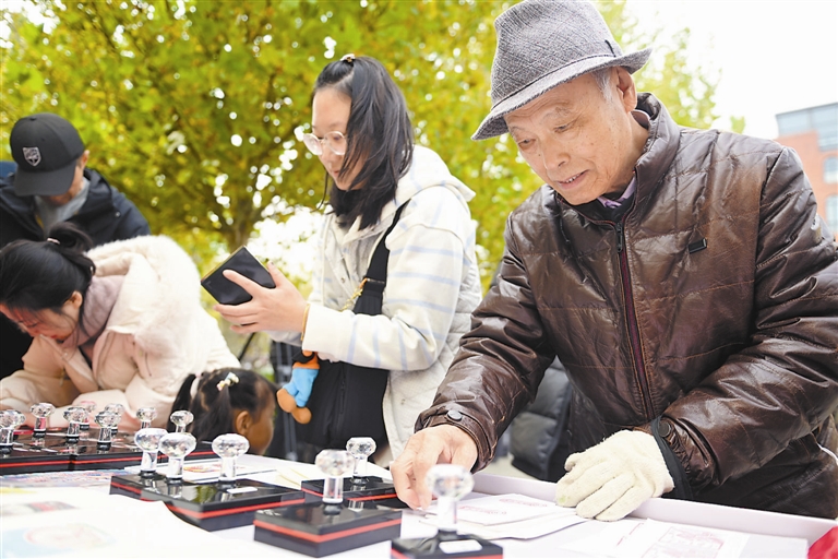 活动现场设置了6款特色印章,每一枚都暗藏巧思。天津农商银行标识章采用“一章双色”设计,经典红黑配色尽显金融老字号的沉稳大气;《今晚报》早点节印章以鲜活红色为主调,满是市井烟火气;4色印章套装对应《今晚报》“文娱”“城事”“社区”三大核心版块;5色“早点节全景章”更是将活动盛况浓缩于方寸之间。把早点节的欢乐亲手“拓”进册子里,这份用心感动着读者,也让他们收获了“烙印”的幸福。