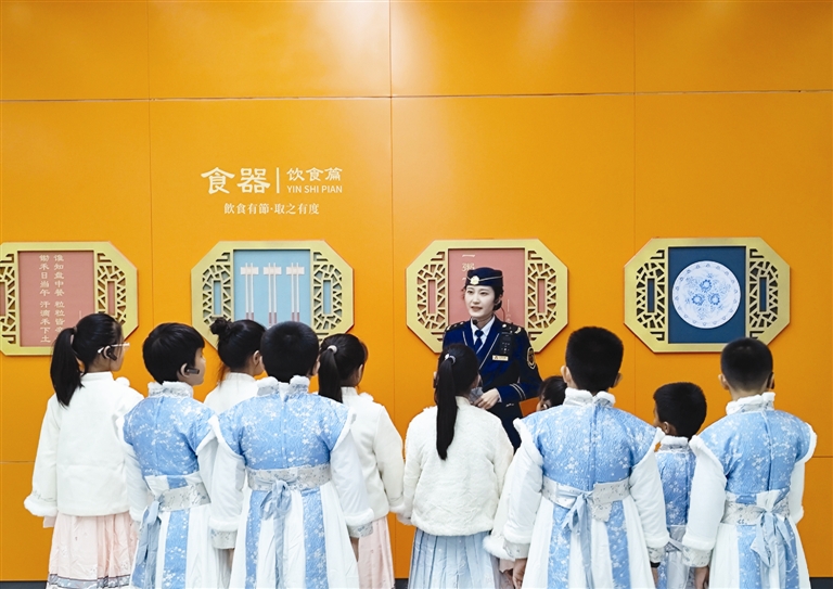 节气礼仪展示区设置了二十四节气展示墙,清晰呈现了每个时令的特点,配套的“节气与饮食”互动游戏更添趣味。通过立春咬春卷、冬至吃饺子、霜降食萝卜等传统的生活习俗,传递古人对自然的敬畏与生活的智慧、诠释“生活即礼仪”的理念。