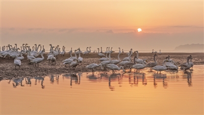 11月5日,在山东荣成市天鹅湖鸿鹄湾,越冬大天鹅在朝霞中栖息、觅食(无人机照片)。立冬将至,全国各地秋意仍浓,以斑斓色彩迎接冬天到来。新华社发(李信君 摄)