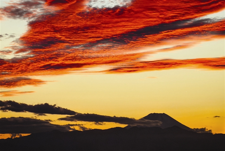 11月6日傍晚,在日本东京拍摄的火烧云与富士山(手机照片)。新华社记者 贾浩成 摄