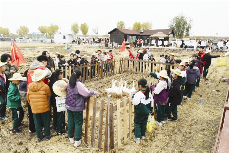 儿童丰收游戏区里,孩子们的笑声此起彼伏,画草帽、扎稻草人、趣味套大鹅三大活动轮番上演,孩子们在沉浸式体验中感受丰收的快乐;在创意绘画区,孩子们用画笔将稻穗、野兔、大雁等秋日元素画在草帽上,戴起专属“田园草帽”成就感十足;在扎稻草人区,大家分工合作,用稻草、旧布料做出憨态可掬的“田间守护者”。稻田边的趣味套大鹅比赛更将氛围推向高潮,孩子们手持套圈瞄准目标,在欢呼声中定格童真时光。