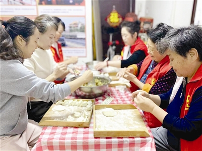 昨日立冬,北辰区普康里社区居委会内一片热火朝天的景象。党员志愿者与社区工作者早早会聚一堂,紧锣密鼓地忙碌开来。有人冒雨采购了新鲜蔬菜和猪肉,有人细心从家中带来了擀面杖、盖帘、大小不一的盆钵,还有人直接搬来了家里常用的大锅。一位志愿者甚至带来了自家准备的虾仁,“添点鲜味,让饺子更香!”