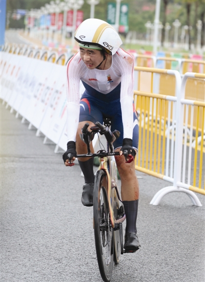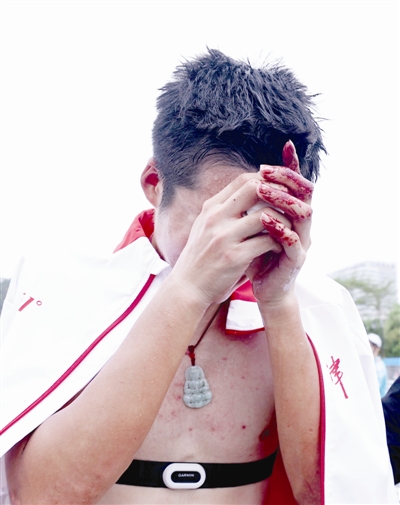 珠海从前一晚就淅淅沥沥下起了小雨,昨天比赛时雨势渐大。薛铭说,赛前就知道会下雨,不过并没有什么心理负担,毕竟上届全运会他就是在雨中夺冠的。“这次比赛心态非常平和,因为参加过一次了,上届比赛前一天我完全就是坐立不安,什么都干不下去,特别紧张。这次赛前很平静,就是按部就班准备比赛需要的东西,然后就休息了。”雨天赛道湿滑,多名选手在同一路段摔跤,薛铭在这一路段也格外注意,特意放慢了速度,但依然未能躲过摔倒的噩运。“教练已经提醒我注意那个位置了,我也已经放慢了速度,但还是失误了。摔倒时确实心里一紧,但我没有想放弃,还是想去争夺冠军。”与多位选手摔倒后选择退赛不同,薛铭强忍着疼痛站起来继续比赛,伤口涌出的鲜血染红了赛车。薛铭一直在心中默默给自己鼓劲,要把意外摔倒失去的时间追回来。只是,“重启”所带来的节奏变化以及更换备用赛车,都对他造成了不可避免的影响,最终只能屈居亚军。