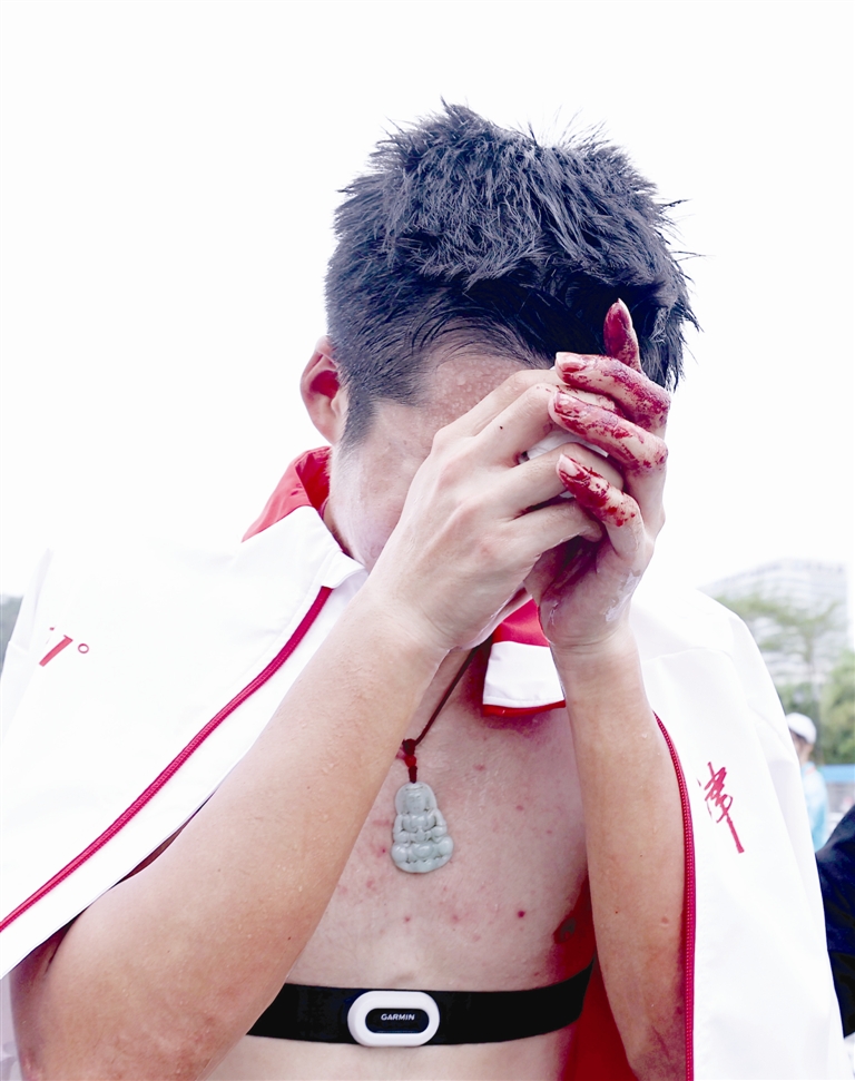 动情和不甘,让薛铭落泪,但面对伤痛,他却很坚强。这次摔倒让薛铭的肩膀、大腿外侧、手指等多处受伤,手指处伤口创面较大,需要前往医院打破伤风针。当赛会医务人员为他清理伤口时,他疼得浑身颤抖,但始终一声不吭。看着他腿上和手肘处的伤疤,不难想象这些年他都经历了什么。他说,自行车就是孤勇者的运动,每一次都是和自己的比拼。虽然本届全运会薛铭留下了遗憾,但这枚血染的银牌却闪着更加动人的“金光”。“今天的比赛已经结束了,这一页就翻篇了。虽然有遗憾,但我不服输,下届我还有竞争力,还要为天津拿下这枚金牌。”擦干眼泪,薛铭的眼中闪着坚毅的光芒。