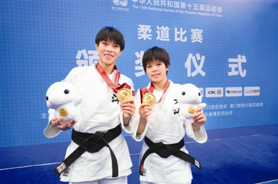 柔道开赛首日,女子48公斤级比赛中,天津队的21岁小将惠欣冉(右)战胜重庆队的颜思,拿到柔道项目首金。一个多小时后,天津柔道队的陶昱颖(左)又在女子57公斤级比赛中夺得第二块金牌。