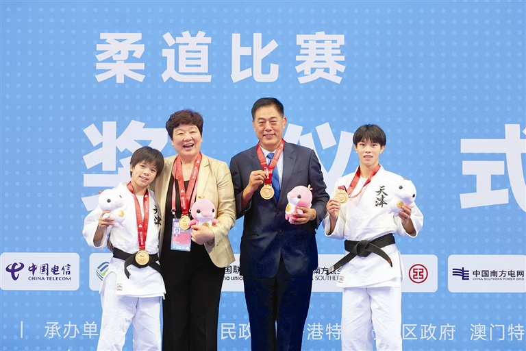 女子48公斤级的颁奖仪式上,所有人都见证了这片赛场上最浪漫的一幕:天津市体育局副局长吴卫凤亲手为自己的丈夫——天津柔道队主教练赵治山戴上了这枚沉甸甸的金牌,二人随即拥抱在一起。