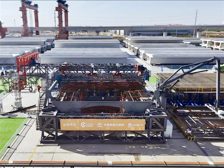 近日,驻津央企中铁建大桥工程局装配科技公司与中国铁路设计集团有限公司、北京建机院联合研发的“龙脊智能”铁路简支箱梁钢筋骨架智能制造设备在津潍高铁天津段投用。