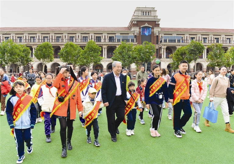 和平区关工委“红色故事宣讲团”团长张振东带领小宣讲员开展五大道红色故事宣讲。