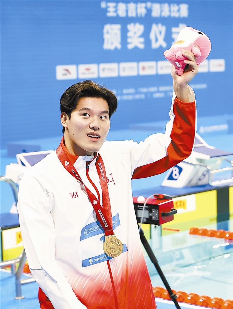 来到十五运会的赛场,王长浩一直在努力调动自己的竞技状态。昨晚比赛开始前的热身环节,他也是最后一个离开比赛泳池的运动员。“赛前热身还是希望多做一些模拟,把速度冲起来,把自己的状态调动得更积极一点。”预赛和半决赛均是以头名身份晋级,王长浩在男子50米蝶泳决赛中位于第四道,他从入水之后便一路保持领先,最终以23秒30夺得首枚全运会男子50米蝶泳项目的金牌,距离他自己保持的全国纪录仅差0.05秒。“拿到这枚很有意义的金牌还是非常激动的,也是对自己这段时间训练的一份回报。其实从预赛到半决赛,再到决赛,自己都是希望冲击全国纪录的,但是最终和自己预想的还是差了一点。”王长浩赛后说,“这次比赛我感觉自己的状态还是比较好的,游起来也挺顺,但是比赛中可能调整出了点问题,没有游出太好的感觉。”