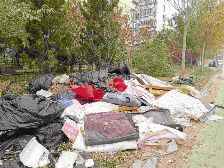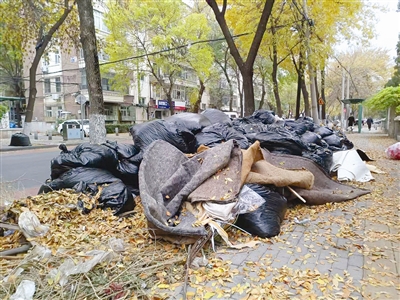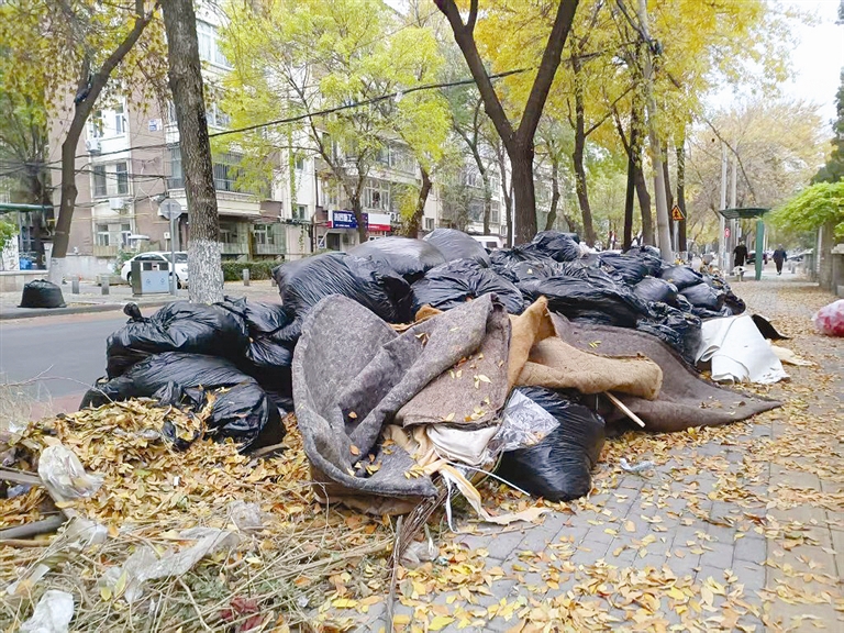 11月6日,在河北区祥和路自北向南去往环江道方向的世纪祥和家园小区一侧,记者看到有长约四米宽约三米的袋装杂草堆积在那里。几个塑料袋已经损坏,杂草裸露着,周围还散落着不少废弃的床垫、沙发等杂物。小区居民介绍,这一现象已经存在将近一周了,不见有人来清理。同样的情况也出现在河北区幸福道。如东里小区一侧人行道上,记者看到有20余个黑色塑料袋盛装的废弃树叶,周围同样散落着不少废弃床垫,占据了人行道的一半,给过往路人通行带来不便。几位随机接受记者采访的市民表示,园林工人清理落叶,暂存在路边情有可原,但应及时清理,避免塑料袋损坏后落叶外撒。此外,由于垃圾堆积,导致个别市民乱扔乱倒,影响市容环境。