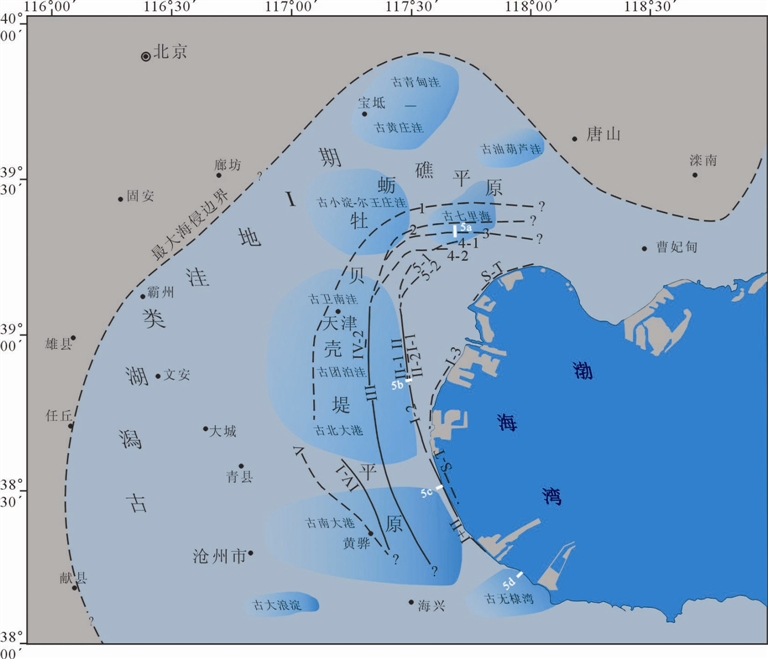 这种原来的河流因海水进侵而流路缩短、河水被高潮海水壅塞而易决口漫溢甚至支流离散的情景,直到最老贝壳堤(5堤)古岸线出现,仍未得到改观。第五道堤从黄骅市西南的东孙村向西北,经静海-天津西-宁河-丰南一线,构成距今约6200~5500年前的障壁岛型古海岸线。从海侵边界中段的雄县附近向东至该岸线宽近70公里、距东北方向天津附近该岸线的距离更有近100公里,《山经》黄河需要足够的时间才能穿过这片面积广大的低洼湿地。从深县东流的《禹贡》河流路要跨越的湿地的宽度,同样达到100公里。因此,我们推测在距今约7000~5000年前这段时间里,北流的黄河被极大地限制在潟湖洼地之中,并非直接进入开放浅海区。