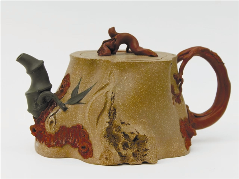 “秦权壶”造型为“秤砣”,庄严稳重。寓意为秦始皇统一六国,统一文字,统一度量衡。这是权力的象征。如在壶上用小篆书体镌刻上“秦权”二字即可,也恰到好处。可见书法艺术在陶艺作品上的装饰同样应该纵观全局,使书法与陶艺和谐统一, 才能达到艺术上的完美结合。