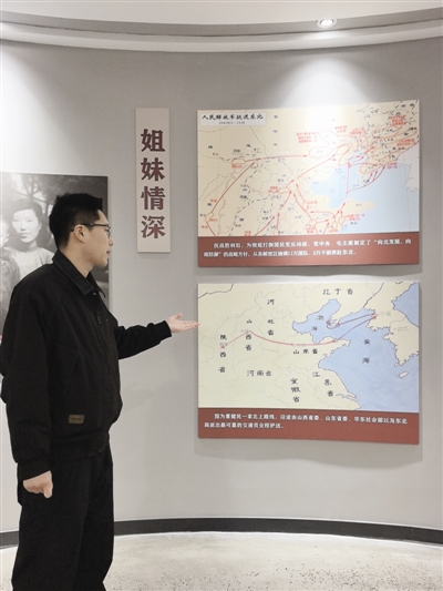 在“奔赴延安”展厅的地图上,红色箭头标记出她们历时8个月、辗转2万里的路线:从天津乘船至香港,后随南洋华侨司机归国服务团辗转广西凭祥、贵州贵阳,然后北上到达西安。行程中,大姐董清民因病痛和过度劳累不幸离世。