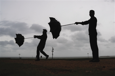 斯里兰卡灾害管理中心27日通报,连日来的极端天气已导致全国至少31人死亡、10人受伤及14人失踪。图为人们手中的雨伞被强风吹坏。