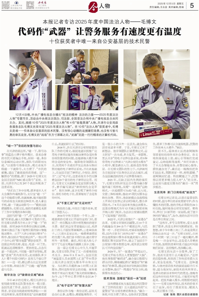 在日复一日的政务服务中,毛博文推动的不仅是政务服务的创新与优化,更是一份信任的累积、一种温度的传递。当被问及如何理解这份看似平凡工作的价值时,毛博文这样回答:“人的一生,到公安机关办事的次数或许仅有那么几次。在这有限的几次交集中,我希望他们都能从中感受到这座城市的真诚与温暖。”