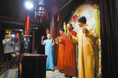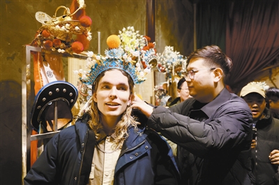 傍晚时分,当采访团走进天津广东会馆,一场融合了建筑、戏曲与沉浸式体验的文化盛宴正等待着他们。在摆满琳琅满目京剧行头的化妆间里,来自美国的Dante被一顶璀璨的紫金冠所吸引。在专业人士的帮助下,他小心翼翼地将这顶冠冕戴在头上。瞬间的沉重感让他不由自主地挺直了脊背,拿出手机频频自拍。随后,在老城小梨园·相声茶馆明快的竹板声中,一场特别的“国际速成班”开课了。台上,来自英、美、意三国的媒体记者手持竹板,有模有样地练习着。Dante一边敲击着手中的快板,一边一字一顿地跟念:“白——日——依——山——尽……”当竹板声意外地与诗句节奏合上拍时,他惊喜地瞪大了眼睛。不知是谁带头喊了一句:“行啊,有点意思!”——这句地道的天津式赞许,立刻引来英国网络名人Eoin的中文回应:“天津,倍儿哏!”