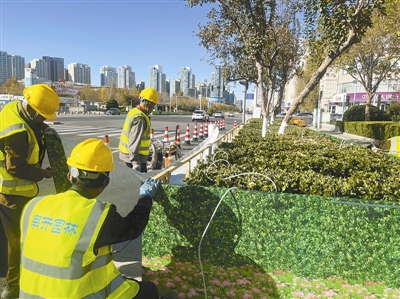 除了冬季行道树的补植补种,冬季还要做好植物的防寒工作,抵御寒风侵袭、低温冻害及融盐积雪侵害,减少水分流失,提高新栽植物成活率。从天气转凉开始,这项工作就在全市展开,特别是对道路两侧和中间的绿篱的保护,也是以一天一个模样的速度进行。如今行走在津城的大街小巷,映入市民眼帘的是绿色枝叶和花朵图案的彩色“冬衣”。