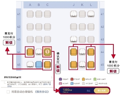 记者通过曾先生提供的截图中看到,普通舱前三排座位为灰色,属于“不可选座位”,曾先生无法选择。在其余可选择的座位中,有中间的“免费座位”以及靠窗和靠过道的“标准座位”,这些标准座位则需要1000积分才可以选择。曾先生告诉记者,他此前乘坐飞机时积累了一些积分,所以可以直接兑换使用。不过他在小程序中也看到,这个积分还可以通过现金购买,10积分2元钱。