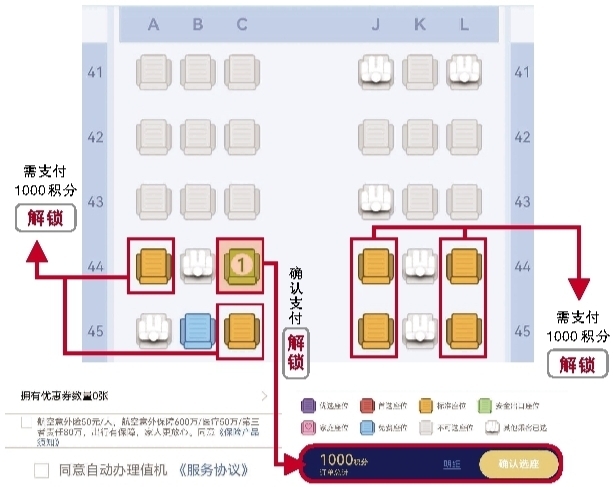 市民曾先生告诉记者,前不久他购买了厦门航空从天津飞往福州的航班,昨天下午,他通过厦门航空App提前线上值机时发现,可直接选择的免费座位寥寥无几,多集中在中间座位或后排区域。一些靠窗或者靠过道的位置,需要额外支付1000积分才能“解锁”,他最终使用积分获得了一个过道位置。