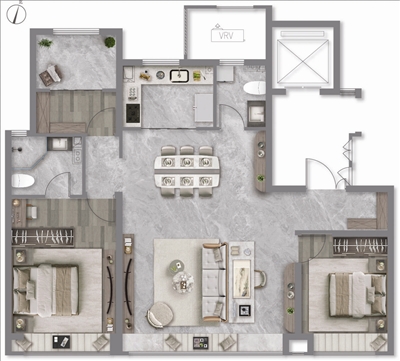 居住的本质在于生活空间的舒适,约128平方米的三居室户型,在设计上更多地考虑居住者的舒适性、私密性与便捷性。主卧的套房设计与次卧融合一体,次卧可以打造成书房,整齐划一的空间感让主人在休息与工作中不受外界干扰,同样也不会影响到家人的日常生活。
