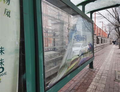 | 站牌广告幕布脱落 市民高女士反映,河西区绍兴道上,一处公交站候车亭的玻璃橱窗内,公益广告幕布脱落,有碍市容观瞻。 文/摄 记者 刘波 |