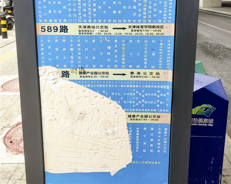 记者在团泊大道的市域团泊健康城公交站看到,有6趟公交车从此站经过。竖式的双面公交站牌,其中有一面的线路信息被撕毁,露出里面的白色泡沫,两条公交线路信息也显示不全。距离不远的梧桐南里站,公交线路信息同样被损坏。记者仔细观察,线路信息板上有划损痕迹,疑似人为所致。