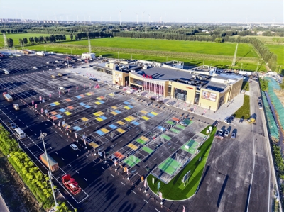 刚驶入王庆坨服务区,停车场灯杆上的电子屏便实时显示着剩余车位,融入鼓楼与运河元素的建筑群前,微缩版“天津之眼”与人造海河景观相映成趣。作为天津20项民心工程之一,这里一举创下多项“首个”纪录——京津冀首个全绿色用能服务区、天津市首个开放式高速服务区、全国首个自行车骑行文化体验馆,成为京津冀高速服务新地标。