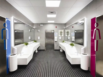 升级后的地铁卫生间,“男卫-01”“女卫-01”等清晰的蹲位编号标注在每个隔间门上,这一细节让设施维护、问题反馈都可以精准定位,提升卫生间管理效率。便民服务从“被动响应”转向“主动触达”,每个坑位门体背面的多功能指引牌公示了车站服务电话,乘客遇到问题可随时拨打电话寻求帮助。卫生间改造后,从设施到标识全面升级,感应式取用洗手液干净卫生,通体柱贴、婴儿护理台、无障碍标识清晰暖心,管理看板让清洁状态一目了然。