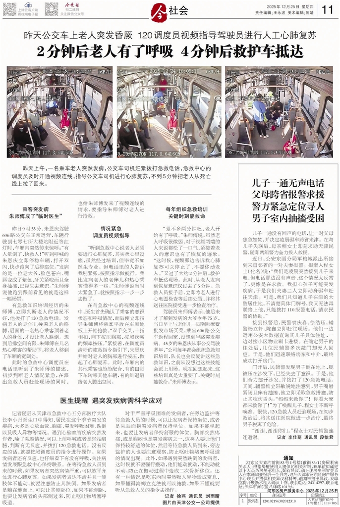 换季时节,心脑血管疾病多发,在公共出行中,此类事件屡见不鲜。在这起事件中,606路驾驶员朱恩庆,在危急时刻沉着施救,急救中心调度员的视频指导,是一场双向的努力。偶然事件的冷静处理,停车、呼救、移人、施救,每一步有条不紊,背后是公交驾驶员多年急救培训的支撑,枯燥的技能培训,在这一刻有了重要意义。急救中心调度员的视频精准指导,打通了院前急救的“最后一公里”。