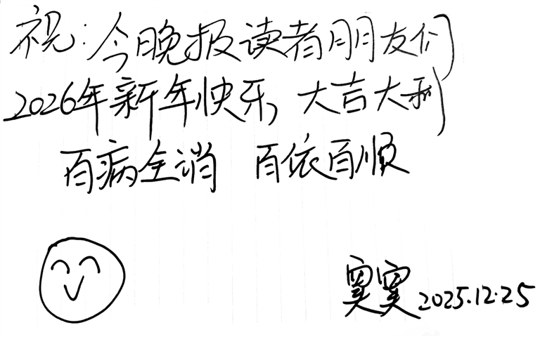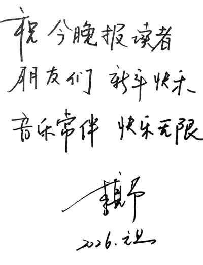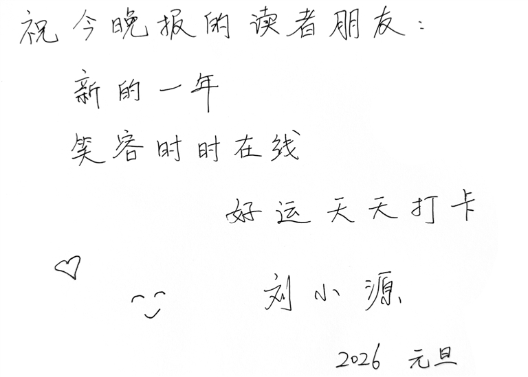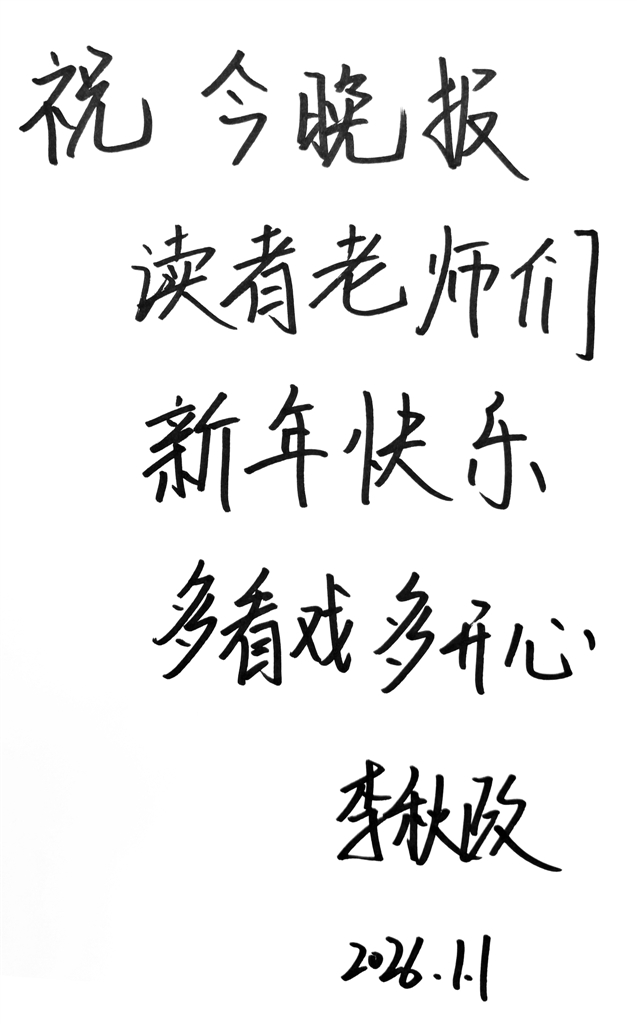 2026年的第一天,李亮节也是在演出现场,并为《今晚报》读者们送上视频与手写的新年祝福。对于自己,他将继续寻找创作灵感,写出更多的音乐作品、唱更多的天津故事,和热爱天津的所有人一起“快乐无限”。