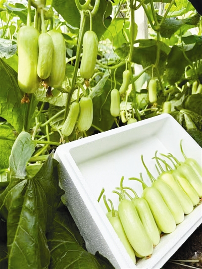 去年秋天,一种口感型黄瓜悄然上市,它适合天津都市型农业特点,这种黄瓜大小和普通黄瓜无异,表面几乎是光滑的,刺也比较少,口感比普通黄瓜好吃得多。它叫津美66,外观特征辨识度很高,主要供应高端超市。