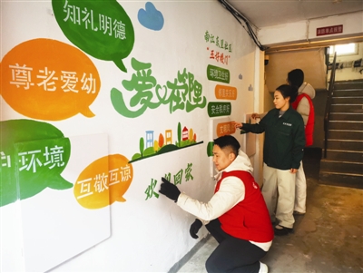 近日,南开区嘉陵道街南江东里社区用实际行动让乱贴小广告者无从下手。社区先选定试点楼门,通过整体墙面彩绘的方法,既让楼道成为新的风景,又起到了消除乱贴小广告的作用。昨天,记者来到南江东里社区看到,这里的居民楼虽然“楼龄”都有三四十年,但是走进整修过的楼门,墙面上清新的色彩搭配和灵动的创意文字,让楼门显示出“年轻气质”。不同的楼门以“心聚家和”“爱在邻里”等为主题,搭配“五好楼门”标准、安全提示语等内容,再加上卡通画和“欢迎回家”等温馨话语,让整面墙看上去既漂亮,又温暖。更重要的是,彩绘墙面让乱贴乱画再也没有了空间。