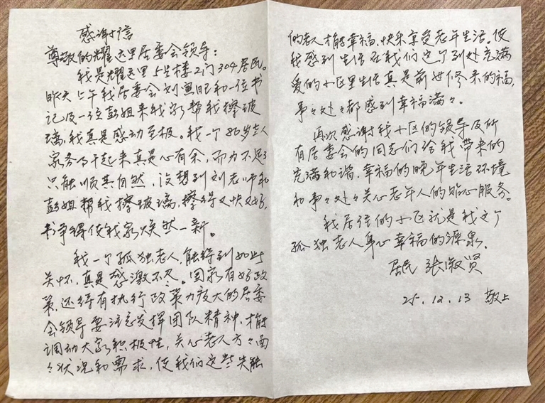 看着焕然一新的窗户,张淑贤老人和周阿姨既惊喜又感动。张淑贤老人提笔写下感谢信,字里行间道尽社区贴心帮扶解决生活难题的感激,直言志愿者们的认真细致让人心里暖暖的。周阿姨则用朴实的话语连连道谢,不住地感慨:“窗户擦得透亮,阳光照进来,家里都亮堂了不少,真的太谢谢社区和志愿者们了。”