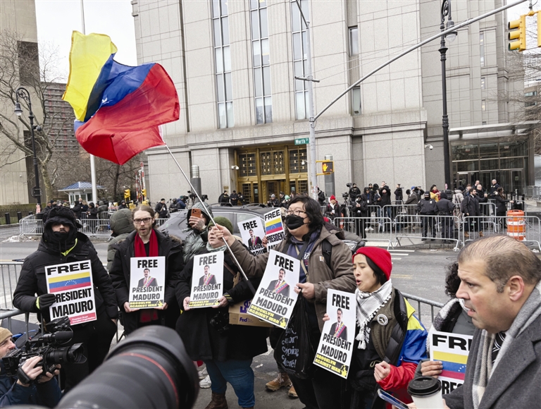 法院外,抗议人群聚集,高呼口号,举着“释放马杜罗总统”“不要向委内瑞拉开战”等标语横幅。现场也有一些人支持美国对委内瑞拉的军事干预。双方针锋相对,警方用金属栅栏将双方人群隔开。
