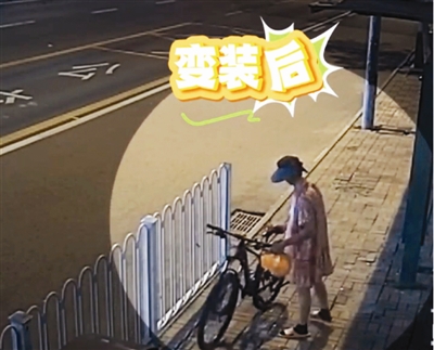 原来,男子骑着三轮车经过公交站时,注意到了未上锁的山地车,他四下张望,见夜深人静,路上也没有车辆经过,便将三轮车停到路口转角,随后从车上取出一个包裹,进行了一番令人啼笑皆非的伪装,男子换上粉裙子、戴上遮阳帽……殊不知,这一切早已被视频监控清晰记录。