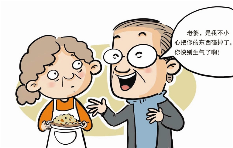 李大妈安顿好小孙子,就到厨房给张大爷打下手,在抽油烟机的“嗡嗡”声中,小声对张大爷说:“谁把洗面奶扔地上了?”张大爷没听清,反问:“你说什么?”李大妈顿时气鼓鼓地说:“耳朵有毛病了?洗面奶怎么掉地上了?也不捡起来!”张大爷一愣,心里顿时明白了,肯定是儿媳在洗手间摆弄东西碰掉的,她着急忙慌的可能也没注意。想到这,张大爷咧开嘴一笑:“我还以为是什么事呢,我刚才去洗手间,一甩手把什么东西给划拉到地上了,原来是洗面奶呀,我本来打算捡起来,可是手机忽然响了,我赶紧到客厅拿手机,接完电话又到厨房做饭,就把捡东西的事给忘了。”他握住李大妈的手:“哎哟,瞧把我老婆给气的,别生气了啊。”李大妈抽出手,冲张大爷狠狠翻了一个白眼,看他傻乎乎地满脸赔笑,心里的气顿时消了。