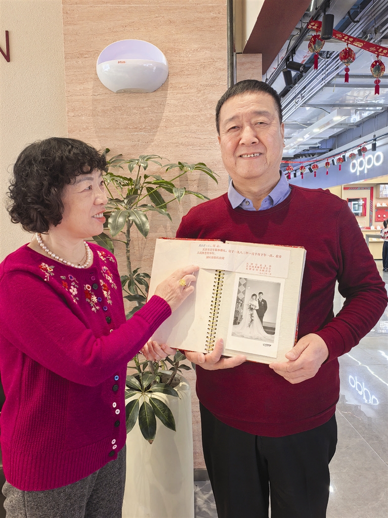 “今天是一个特别的日子,44年前的今天,我和老伴儿参加了天津市青年集体婚礼。”1月10日上午,阳光透过玻璃窗,洒在泛黄的相册页上,71岁的天津市房产住宅科学研究所退休干部殷胜群捧着这本厚重的老相册,指着一张黑白照片向记者介绍说。照片里,两个青年并肩而立,笑容腼腆而真挚。殷胜群身旁,70岁的王绍红微微倾身,眼里映着同样的光芒。