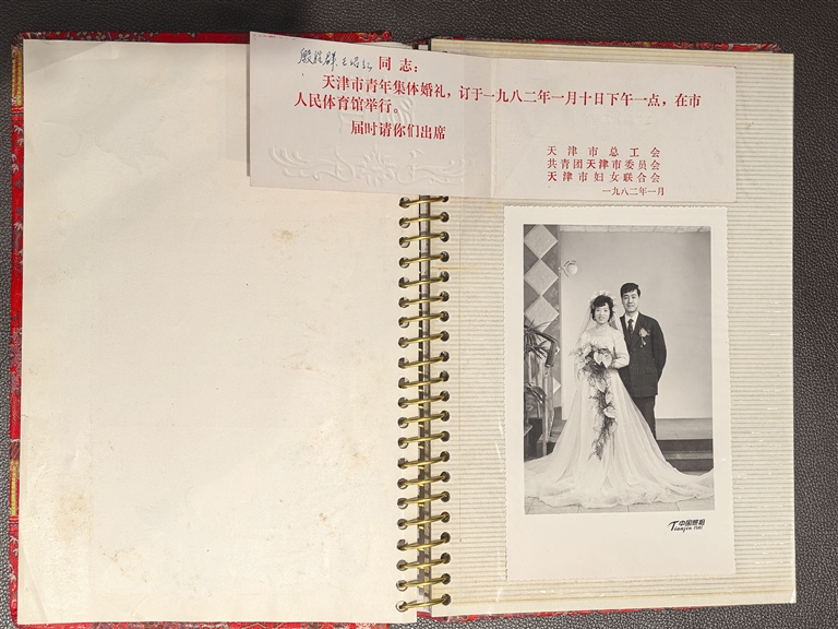 “这是我们的结婚照,也是家里最珍贵的老物件。”殷胜群说。1982年1月10日,天津市总工会、共青团天津市委员会、天津市妇女联合会,在天津市人民体育馆为696对新人举办了一场“移风易俗、婚事新办”大型集体婚礼。那是改革开放后天津首次举办集体婚礼,殷胜群和王绍红就在其中,“那年我刚27岁,她比我小一岁,正是赶潮流的时候。”殷胜群回忆说,当时他在天津市房管局壁板厂工作,王绍红在百货大楼上班。上世纪80年代初,社会上逐渐兴起婚礼大操大办的风气,不少家庭为彩礼、嫁妆所累。这场集体婚礼,像一股清流,给许多年轻人带来了新选择。