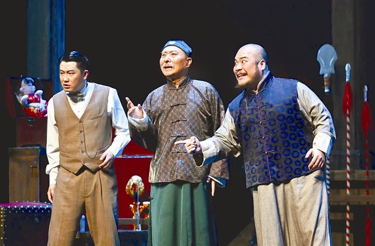 原创喜剧《戏台》以民国军阀混战为背景,围绕京城闻名的戏班五庆班的一场演出风波展开。该剧将话剧的结构与戏曲的神韵巧妙融合,演员们不仅在台词对白中尽显戏剧张力,更在关键情节中亮嗓唱戏,将京剧“唱、念、做、打”的独特风采融入话剧表演,刚柔并济的演绎配合精妙的舞美设计,全景式呈现戏班生存百态。