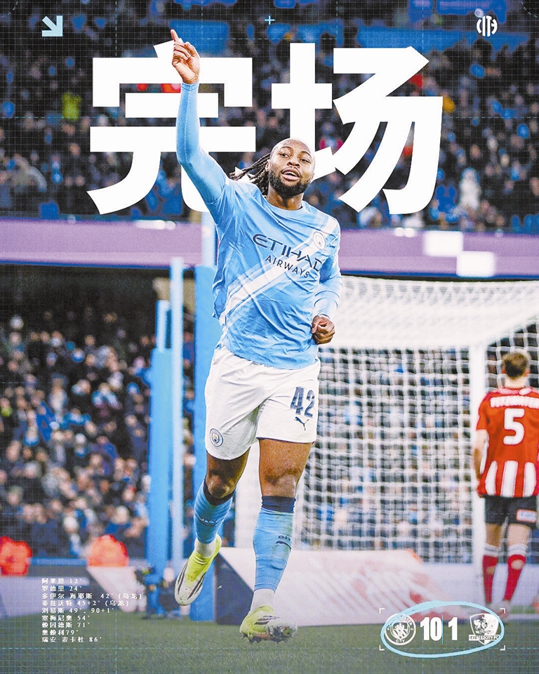 北京时间昨天,曼城队在足总杯第三轮中10比1大胜英甲球队埃克塞特城队,追平队史最大比分取胜纪录。新援塞梅约首发并传射建功。