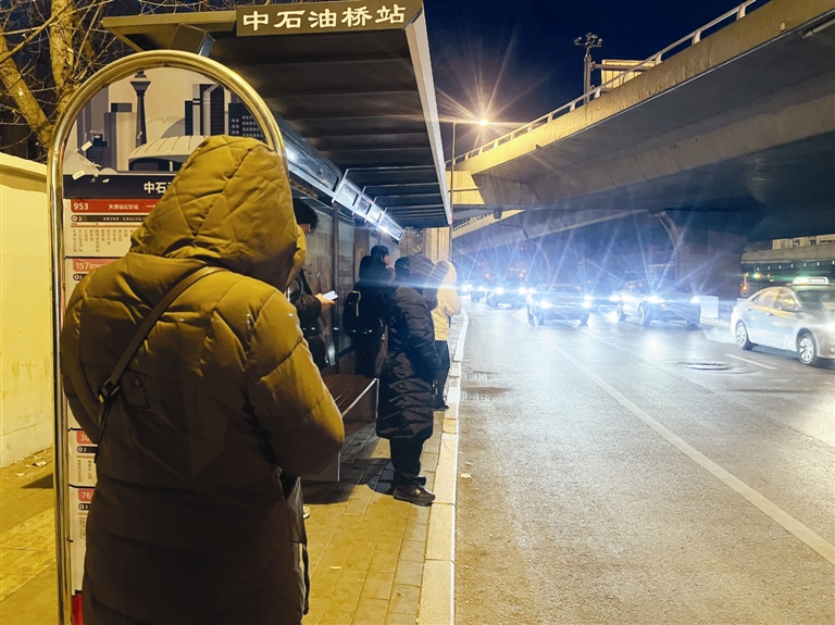 1月19日17时55分,手机屏幕显示-8℃。正值晚高峰,中石油桥公交站候车群众不少,有人裹紧外套、跺脚取暖,频频望向车辆驶来的方向。在17时55分至19时18分的83分钟里,记者记录了953、713、826等线路的到站情况,多条线路候车时长超出市民预期。