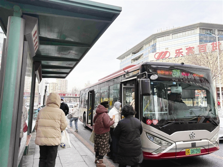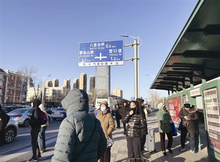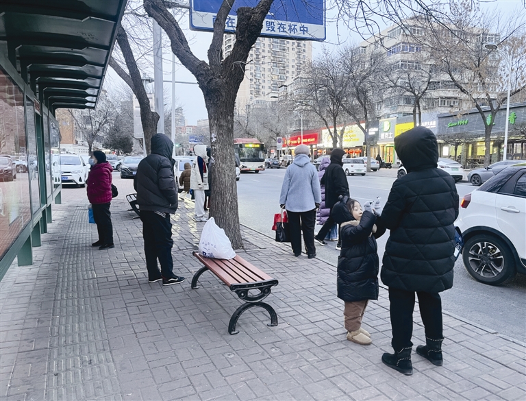 1月19日13时30分,手机屏幕显示-8℃。滨江道公交站有几位年长的候车人,他们穿着厚厚的防寒服,帽子、围巾“全副武装”,或双手插在口袋里,或戴着手套。