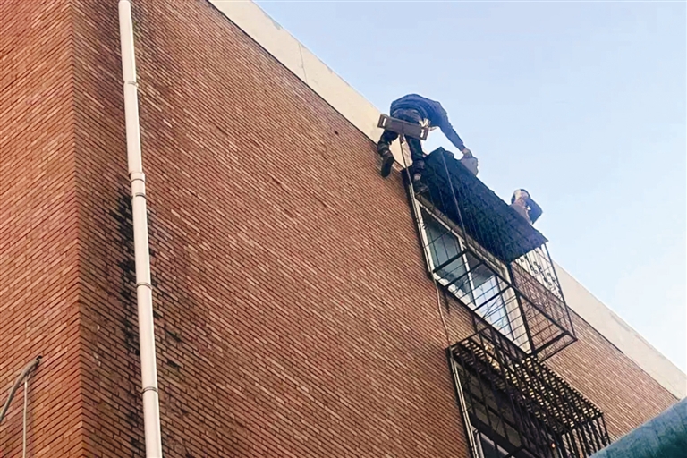 社区与物业工作人员接到消息后赶到现场,拉起了警戒线,竖起警示牌,提醒居民绕行。随后,住建部门安排的抢险人员携带工具抵达,爬上楼顶紧急作业。不到一小时,松动墙体被清除干净,路面也恢复整洁。