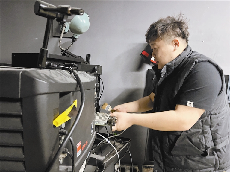 另一间办公室内,店长慈焕钧正忙着对接各种工作,“影城刚开业,而且春节档快到了,要处理的事儿还是挺多的。”处理完手头的工作,他又跑到楼上挨个检查放映设备,虽然楼道温度只有个位数,但他为赶时间只穿了件短坎肩,“之前我们有专人负责这些设备,现在谁值班谁负责检查,目前也能忙得过来。”听说记者要给他拍张照片,慈焕钧一边摆弄机器一边笑说,“拍照没事,就是今天没顾上洗脸洗头……”