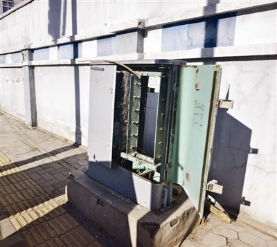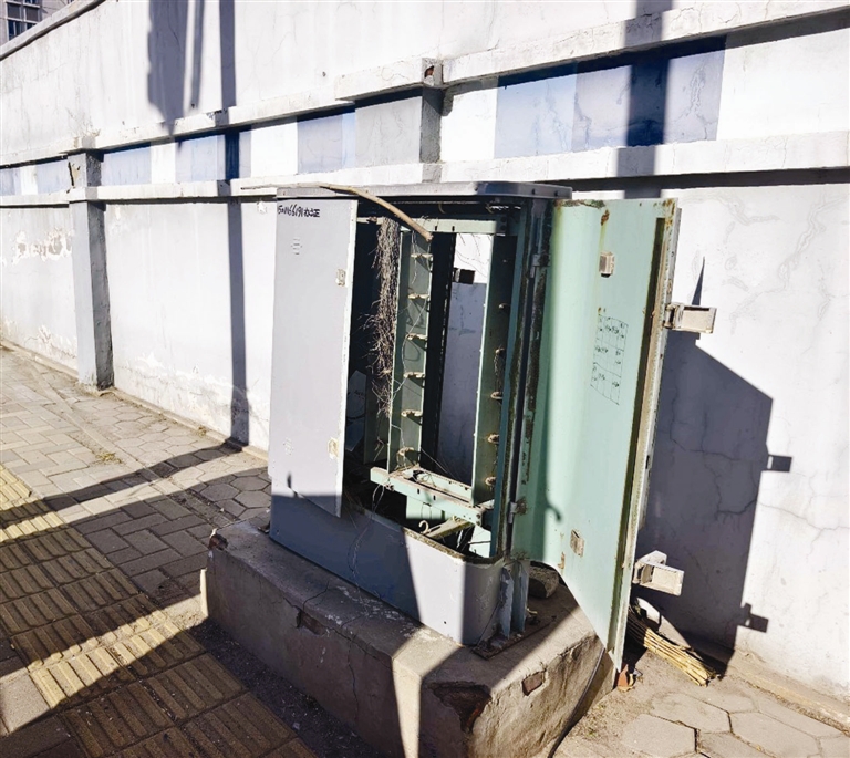 河西区澧水道与太湖路交口附近,便道上一个柜箱损坏。箱门敞开,箱体内线缆散乱,疑似闲置,望尽快修复或移除。